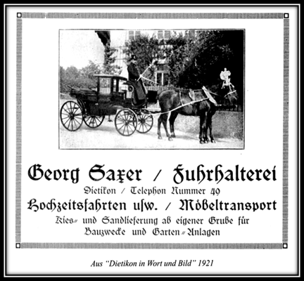 Gut befreundet war Saxer mit Kantonspolizist Hefti vom Posten Dietikon. In der Kiesgrube im „ Müsli “ war während 25 Jahren Josef Koller beschäftigt, der mit seiner grossen Familie auch im Hause Saxer wohnte. Als Aushilfskutscher sprang bei Saxer ein Mann mit spitz gedrehtem Schnurrbart immer gerne ein: Simon – Filialleiter Josef Trutmann – Heinrich (1876 – 1970). Er war 1904 mit Familie nach Dietikon gekommen und schätzte es sehr, seine Erfahrung als Kutscher des Hotel Ochsen in Zug und als Postillion auf der Strecke Zug/Menzigen/Aegeri weiter verwenden zu können.