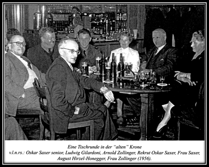 In Erinnerung geblieben ist auch der ledige Knecht Otto Baumgärtner, „ Tschulo“ genannt. Er soll für sein leibliches Wohl bis zu 10 Liter sauren Most im Tag benötigt haben. Vielleicht war dies mit Grund dafür, dass er lange Jahre im Sommer bei den Schweinen und im Winter bei den Pferden im Stroh seine Nachtruhe suchen musste. Es mundete ihm auch wenig, bei Saxer jeden Mittag das gleiche Süpplein vorgesetzt zu bekommen. Nach heftigen Auseinandersetzung mit seinem Chef suchte „ Tschulo“ zur Beruhigung oft das Weite, kehrte dann aber nach einigen Stunden wieder reumütig an seinen Arbeitsplatz zurück. Der arg fletschende Kettenhund, Tschulos Freund, liess keinen Unbefugten in die Nähe der langen Scheune. Dank einem unter dem Dachvorsprung gespannten Laufdraht konnte er im Nu von einer Ecke zur anderen sausen.